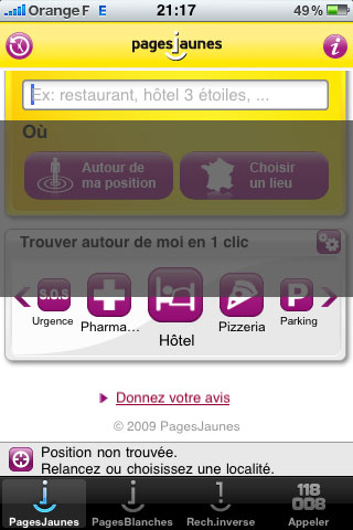 Les pages jaunes ne sont pas compatible iPhone OS 4.0 et le montrent.