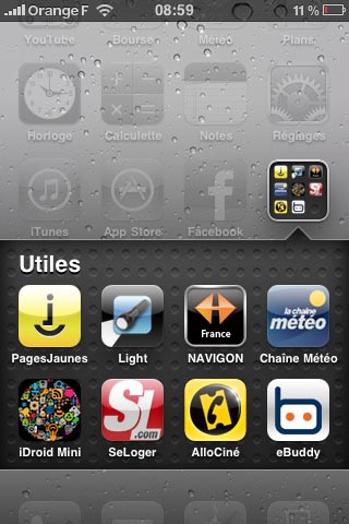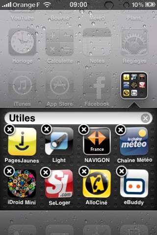 Les précédents iPhone OS empêchaient de voir toutes les applications installées quand vous dépassiez un certains nombre. Vous pourrez avec l’iPhone OS 4.0 créer des groupes. Comment faire ? Le plus simplement du monde, il suffit de rester appuyer sur une icône pour enclencher le mode modification (comme avant). Ensuite vous glissez une icône sur une autre et le groupe est créé ! Vous pourrez nommer ce groupe et y mettre jusqu’à 12 icônes. Chaque groupe prend en visuel les icônes des applications contenues dans le groupe.