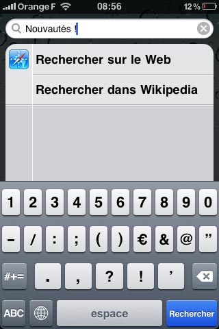 La recherche Spotlight se dote d’une nouvelle fonctionnalité. Outre la possibilité de chercher à l’intérieur des données de l’iPhone, vous pourrez maintenant recherche sur internet et directement sur wikipedia.
