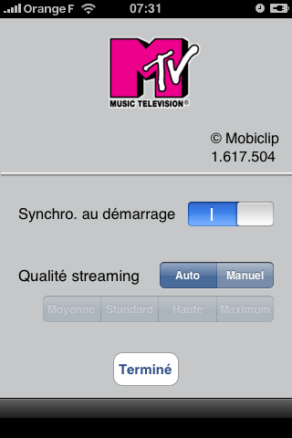 L’application MTV pour iPhone possède aussi quelques options sympathiques comme le choix de la qualité de l’image. Lorsque vous êtes en Edge ou en 3G, l’application MTV pour iPhone réduit la qualité de l’image pour que la télé ne rame pas trop mais vous avez la possibilité de modifier la qualité pour ne demander à avoir qu’une image de qualité maximum (même si ça peut ramer).