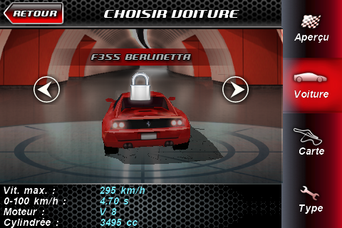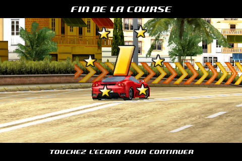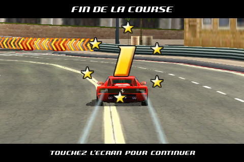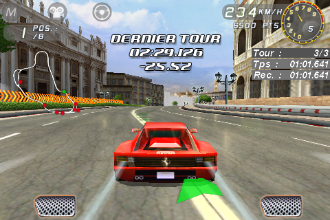 C’est à se demander s’ils ont déjà conduit une voiture. Il y a un temps de réponse entre le moment où vous appuyez sur le coté de l’écran et le moment ou la voiture tourne, alors pour la précision on repassera. En plus, une Ferrari est une voiture nerveuse et là c’est tout le contraire, les voitures sont mollassonnes… Imaginez vous arriver à fond dans un virage en essayant de tourner légèrement… Comment ? Utiliser le frein ? Ah oui mais non, une simple pression sur le frein vous fait partir en dérapage, même pour un tout petit virage où il suffirait juste de décélérer. Ah bah non on ne peut pas, la voiture accélère toute seule 🙂
