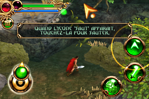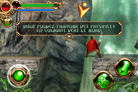 Bloqué et besoin de passer à la plateforme loin au dessus ? Déjà c’est possible uniquement si les développeurs l’ont décidé (bah ouais, pas le droit de sauter hein 😉 ) et dans ce cas la, un bouton apparait pour qui, une fois pressé,  vous fait atteindre la plateforme en question. Mouais… Le système de « petit saut » (comprenez par la, sauter devant vous pour atteindre la rive en face par exemple) est automatique. Vous avancez au bord de la plateforme ou vous êtes et le personnage saute tout seul. Ok, on est pas dans un Mario mais bon un bouton de saut aurait été le bienvenu, rien que pour les enchainements quand vous lattez des ennemis…