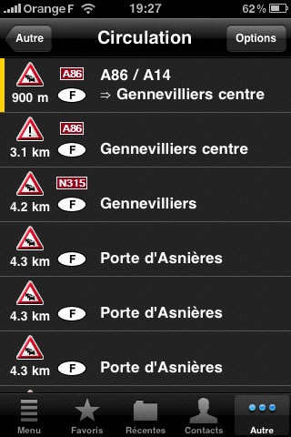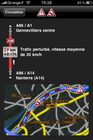 J’étais curieux de mettre en pratique cette option histoire de voir si ce n’était pas du pipo. Je n’ai pas eu à attendre très longtemps ! Ce matin, après avoir amené ma fiancée au boulot dans l’est parisien, je devais repartir chez CBS à Levallois Perret, totalement à l’opposé de ma position. Le périph était blindé, il était 7h55 et je me voyait déjà arriver au boulot à plus de 9h30. J’ai alors sorti mon Navigon pour iPhone pour suivre sans réfléchir ce qu’il allait me dire histoire de voir si c’est performant ou pas.