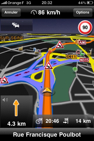 Résultat, je suis arrivé au boulot à 8h32, soit quelques minutes de plus que lorsque le périph est fluide et la je dis un grand BRAVO à Navigon et à sa gestion du trafic. En plus d’une interface clair, simple et d’un logiciel super bien foutu avec du text to speech bien classieux (le GPS vous donne le nom des rues très lisiblement, genre tourner à droite sur la rue édouard vaillant), la gestion du trafic est un très très gros plus. Lorsqu’on l’utilise, on peut avoir peur de finir perdu pour rien dans des petites rues inconnues mais au final, Navigon pour iPhone se revele être une vrai petite merveille. Par contre, prévoyez un câble allume cigare sinon la batterie ne va pas faire long feu 😉