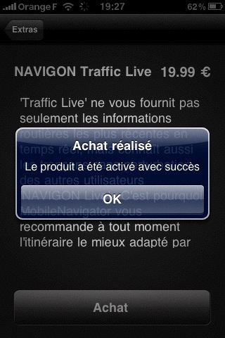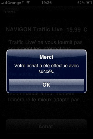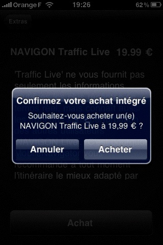 Sortie il y a peu, la mise à jour de Navigon pour iPhone apporte la possibilité d’acheter « In app » (c’est à dire acheter directement dans l’application, sans passer par l’App Store). Seule options disponible pour le moment pour Navigon, une gestion du trafic à 19€. Outre la position des divers bouchons et ralentissement, la gestion du trafic de Navigon est censée recalculer l’itinéraire en fonction du trafic pour vous donner un chemin alternatif plus rapide pour vous rendre à votre destination.