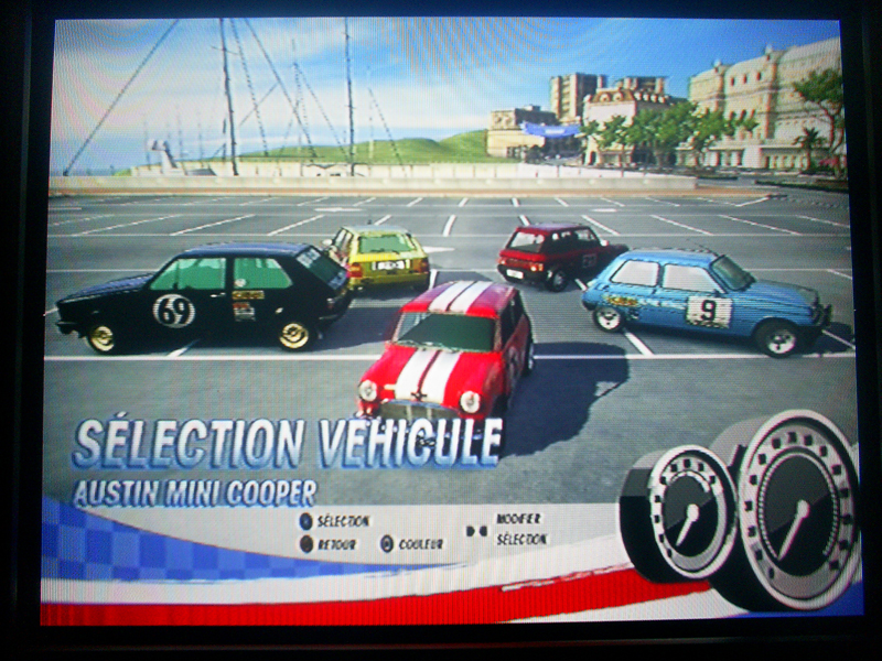 Une fois le mode choisi. Vous devrez choisir votre voiture (Mini, R5… j’ai pas noté les autres 😉 ) et ensuite le type de transmission.