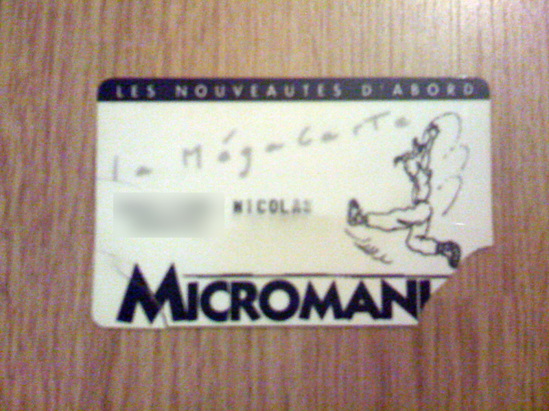 En fait chez Micromania je suis client depuis le tout début, au point d’avoir encore le tout premier modèle de la mégacarte, la carte de membre Micromania. Elle a maintenant 18 ans (ouais ça se voit hein), je l’ai eu début 1991.